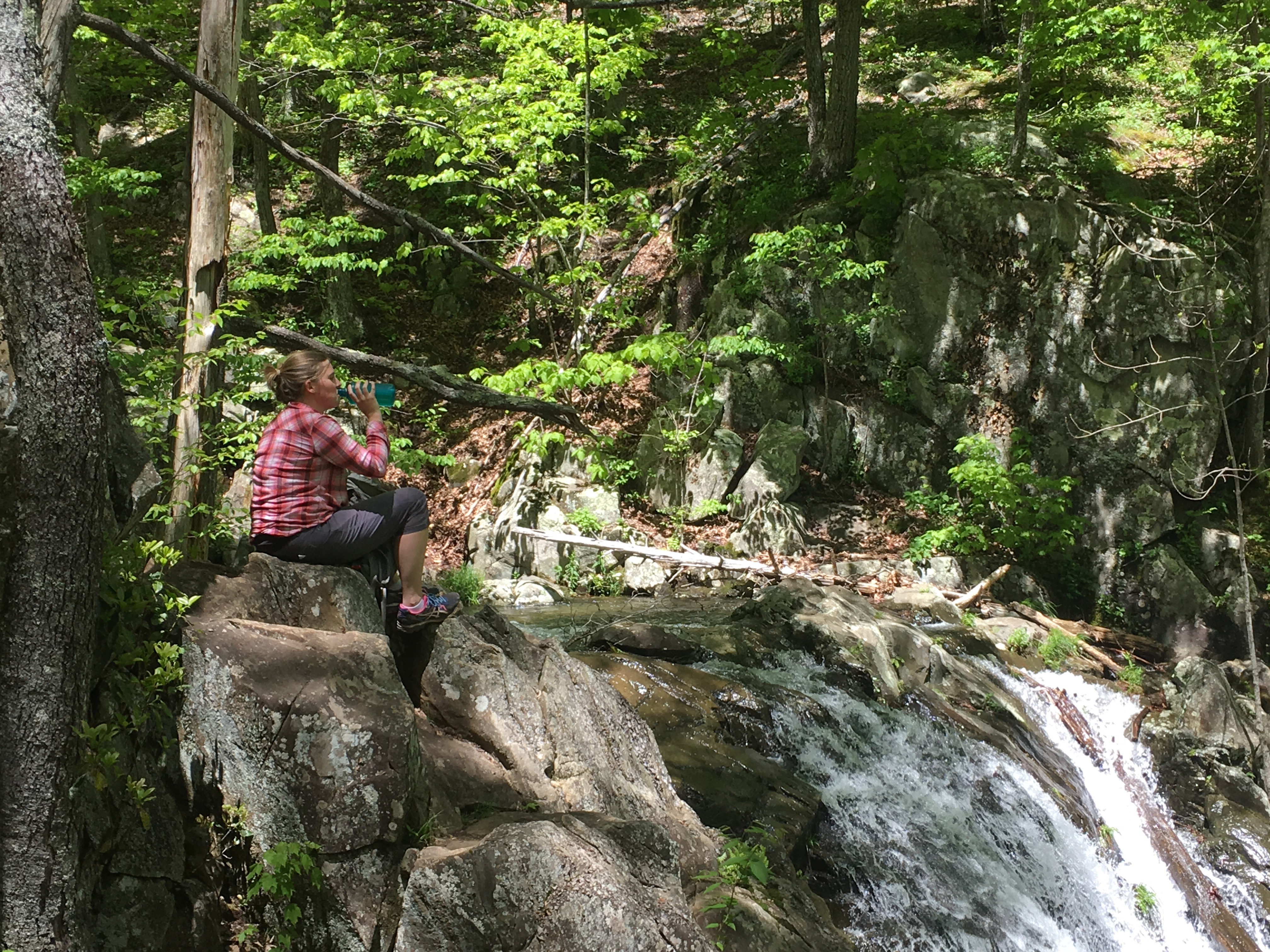 Colleen drinking water beside the Rose River Falls.