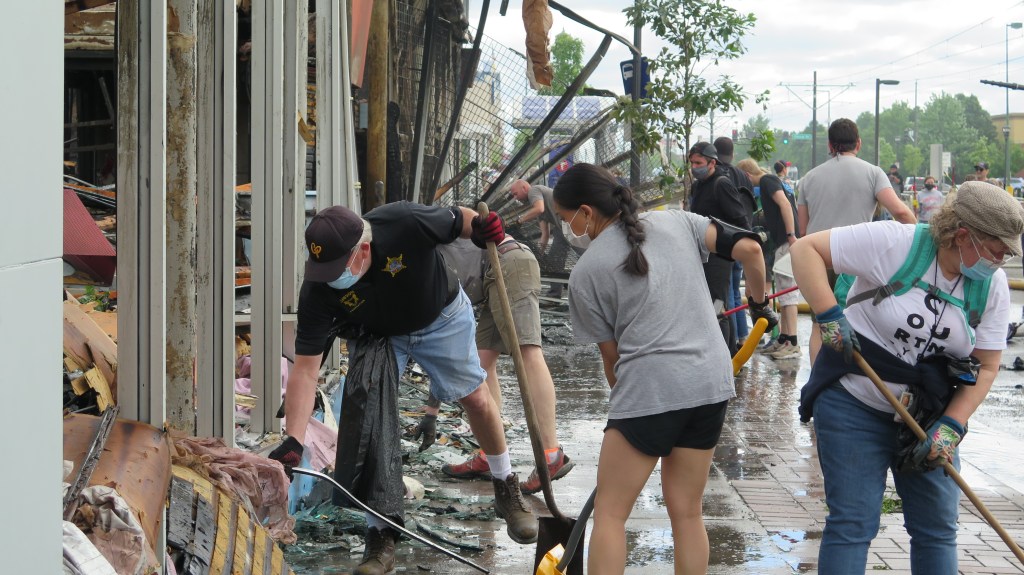 An image of community members cleaning up the debris broken glass and burnt down buildings in St. Paul, MN