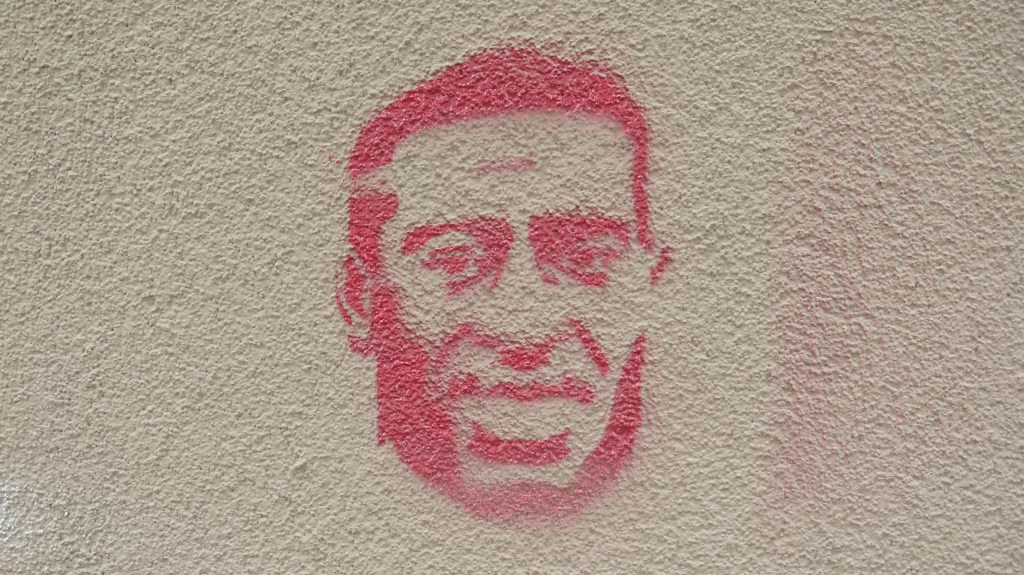 Graffiti of George Floyd’s face on the wall of a building in St. Paul, MN