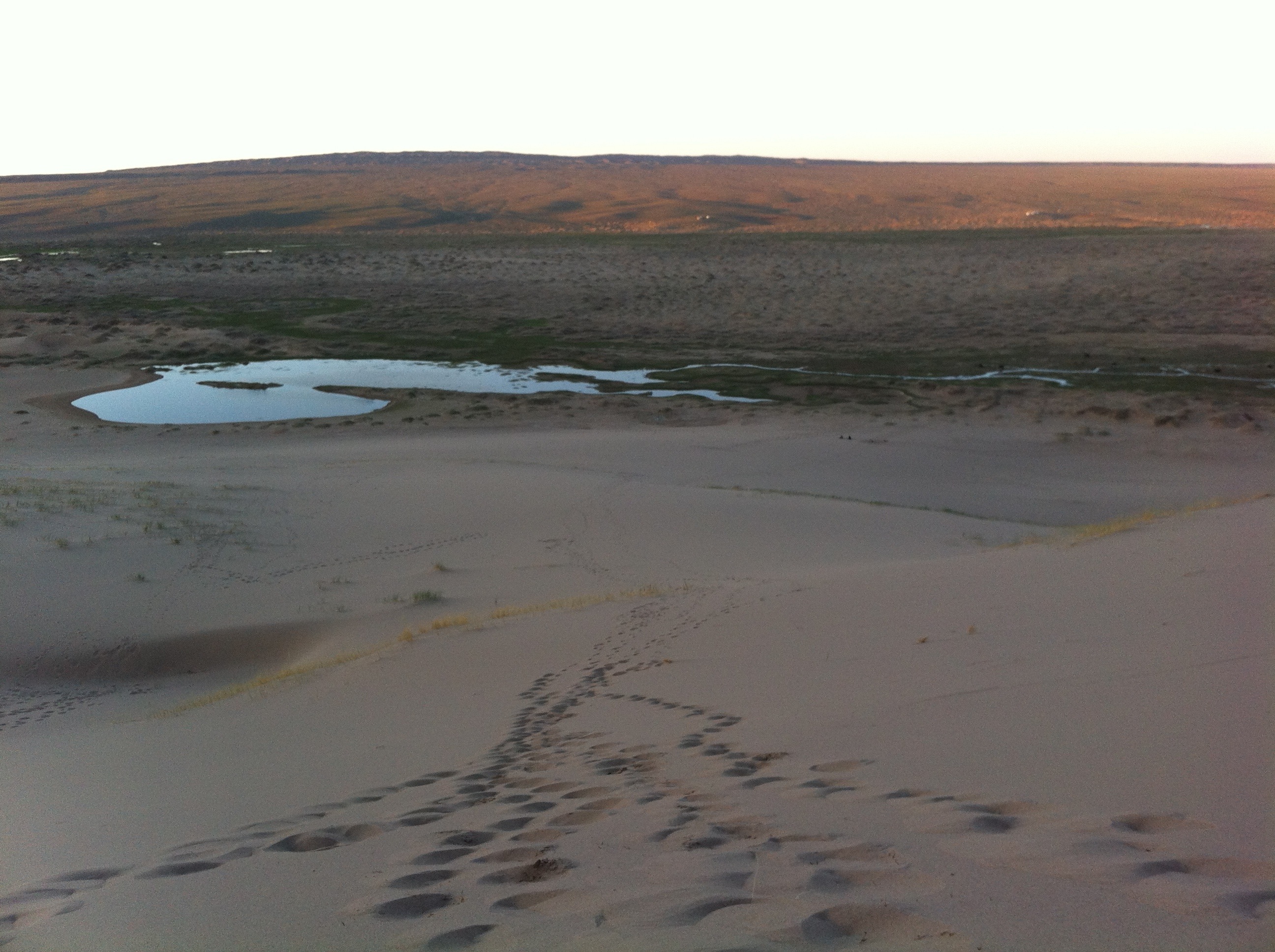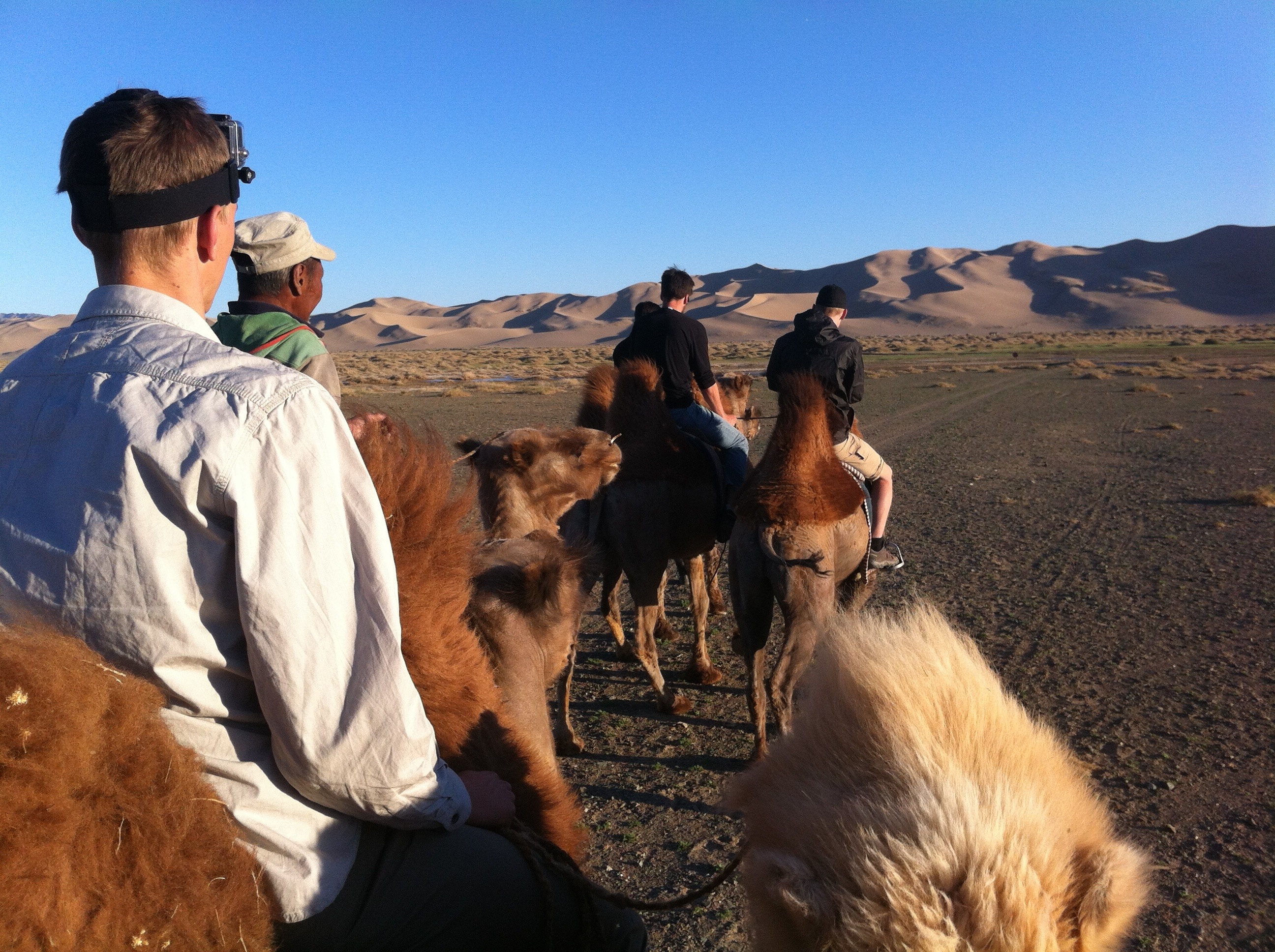 We stayed for a few hours and then we jumped into the van again and were off to the complete opposite landscape: The Sand Dunes. Before that day, I had never seen big sand dunes before (except for the dunes in Oregon). I didn’t know what to expect. All I knew about them was from Aladdin or from Road to Morocco, when Bob Hope and Bing Crosby get caught by a beautiful princess while riding a camel in the sand dunes. When we arrived it was nearing dusk and the sand dunes were a beautiful pink/yellow color. The ger owners had camels for us to ride, so we jumped onto some camels and traversed the fields towards the dunes. The colors of the sky and dunes were wonderful.