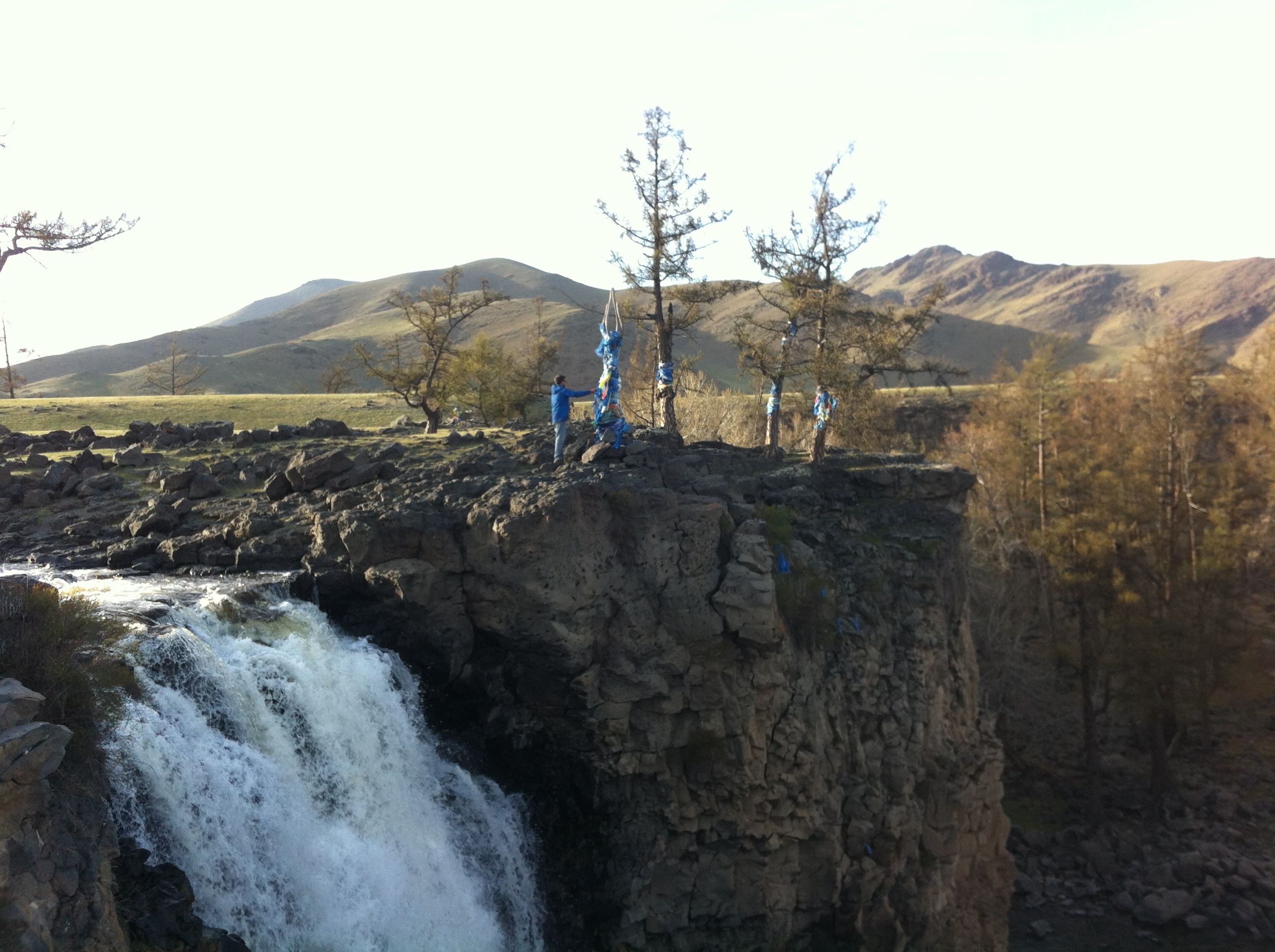 We continued on our way and finally reached the nature reserve. We drove through the reserve for a couple hours and stopped a couple times to use nature’s toilet and to watch the horses pass by. There were so many horses. We made it to the ger camp before sunset and were able to visit the famous waterfall. It was only a 10-15 minute walk away from the ger camp. And man was that waterfall gorgeous. The evening sunlight made the whole place look magical. The wind had died down by then, so I sat down beside the top of the falls, listening to the water rush by. I looked around me and could see there were mountains surrounding us, that there are hundreds of yaks/cows grazing nearby, and that the sun was setting to the west. What a beautiful place. I spent the rest of the evening teaching frisbee and playing soccer with the local children.