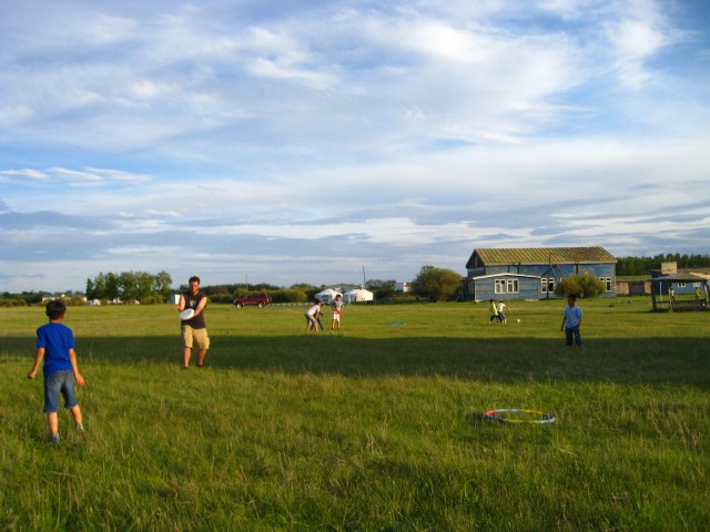 Well, the children were frickin’ adorable. Dream camp is an English camp, so these kids come here to practice their English. Some kids are from the city, so their English is very good, while some of the other children are from the countryside and their English is very limited. My job was to teach English to the 14 year olds with a Mongolian co-teacher. I would spend 1 hour each day with them teaching vocabulary and speaking aloud so they could listen to my accent. The rest of the day was filled with activities and free time. Often enough the children would play basketball, soccer, or hangout in their rooms. During the activity times, the counselors would lead the children in either outdoor games or singing lessons. I ran both activities on different days. During singing time, I taught Itsy Bitsy Spider, I’m a Little Tea Pot, and The Lion Sleeps Tonight. Meanwhile, I taught elbow tag, lighting (a basketball game), and helped with kickball during outdoor time. Nick (a PCV) and other kids playing FrisbeeThe cafeteria and a dormitory.