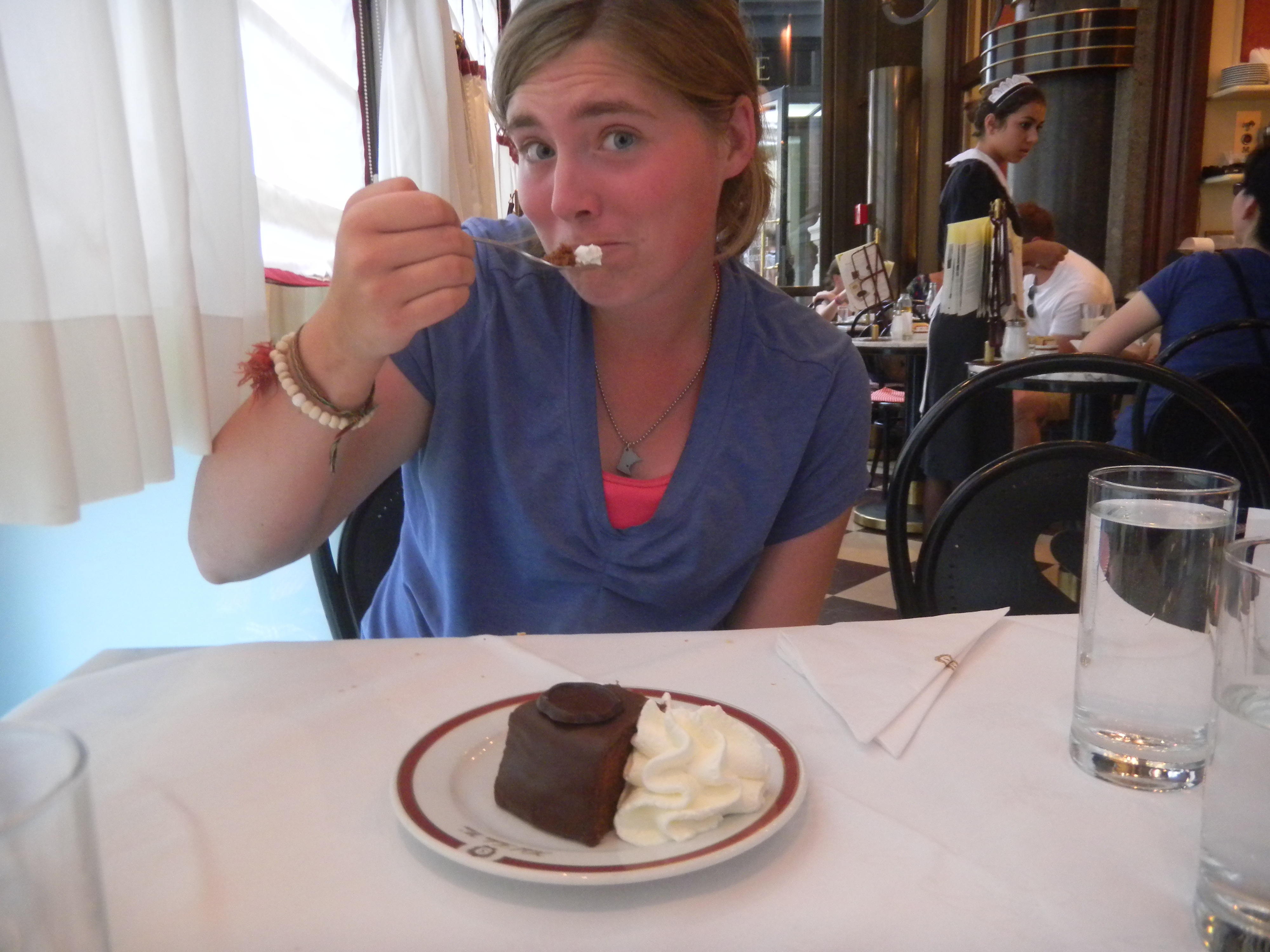 The next day, we decided to do a bus tour to the Prater, a famous park with a historic ferris wheel. We learned some info on the city and then explored the park. It ended up being an amusement park of sorts, I felt like I was at the Minnesota state fair! We found the ferris wheel and rode it. We got a great view of the city. I learned that after the bombings in Vienna, almost all the prominent buildings burned to the ground. Well, the ferris wheel carriages may have burned, but the ferris wheel was still turning after the air raids. This inspired some people to rebuild Vienna. My Dad and I also went on a swing ride that took us well above the skyline. I enjoyed the wind betweens by toes and the view, but I think my Dad was scared the whole time… (sorry Dad!). After the park, we ate lunch at the world famous Sacher Cafe (I’d never heard of it), and ate world renowned chocolate cake. It was pretty darn good.