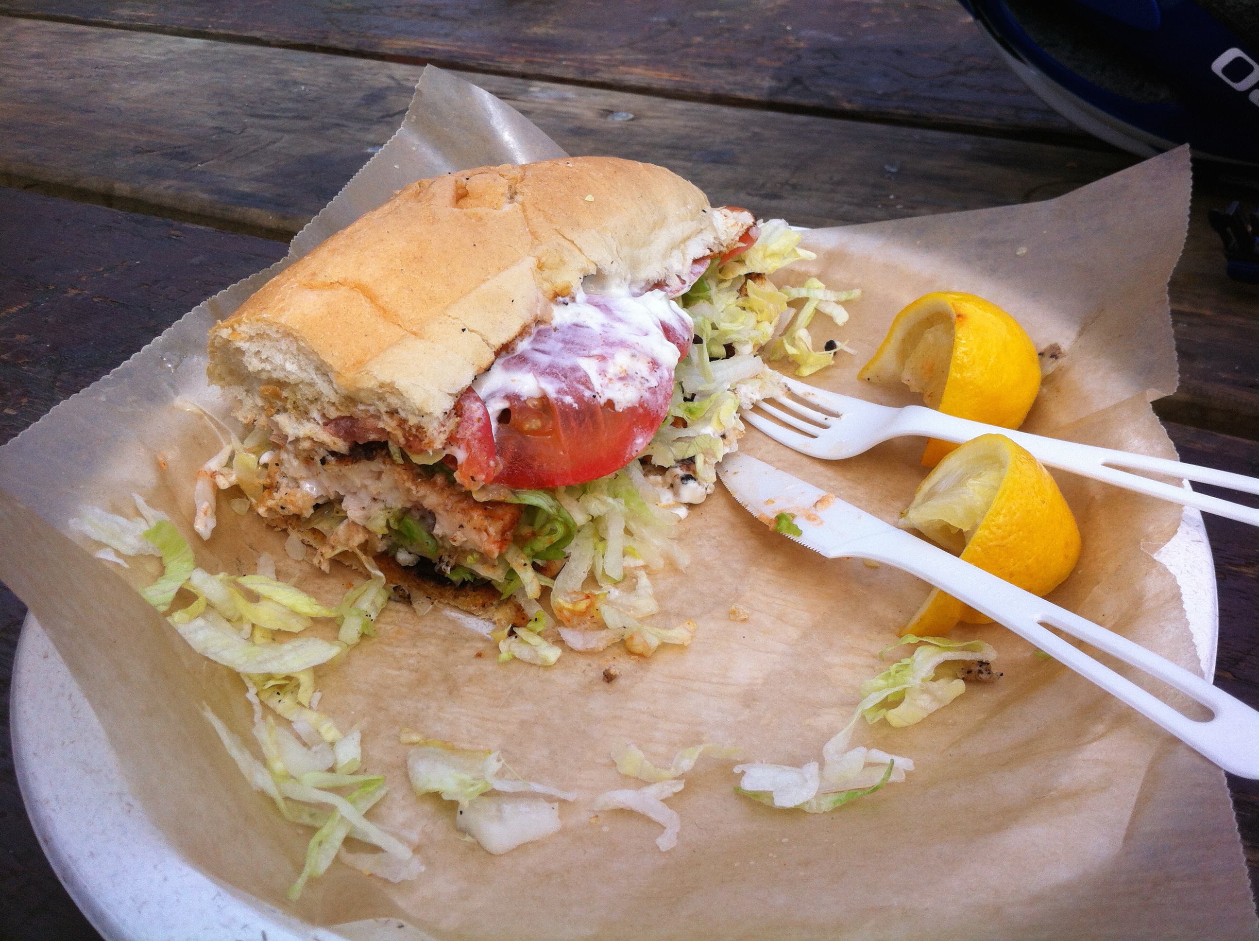 After getting the permit, I decided to pop-a-squat next to a visitor sign on Pike Island. It felt very nice to rest my legs. On the ride back home, I stopped by Sea Salt Eatery and got myself a grilled salmon po boy. It was so good. I had never had one before, but I plan on eating another one in my near future.