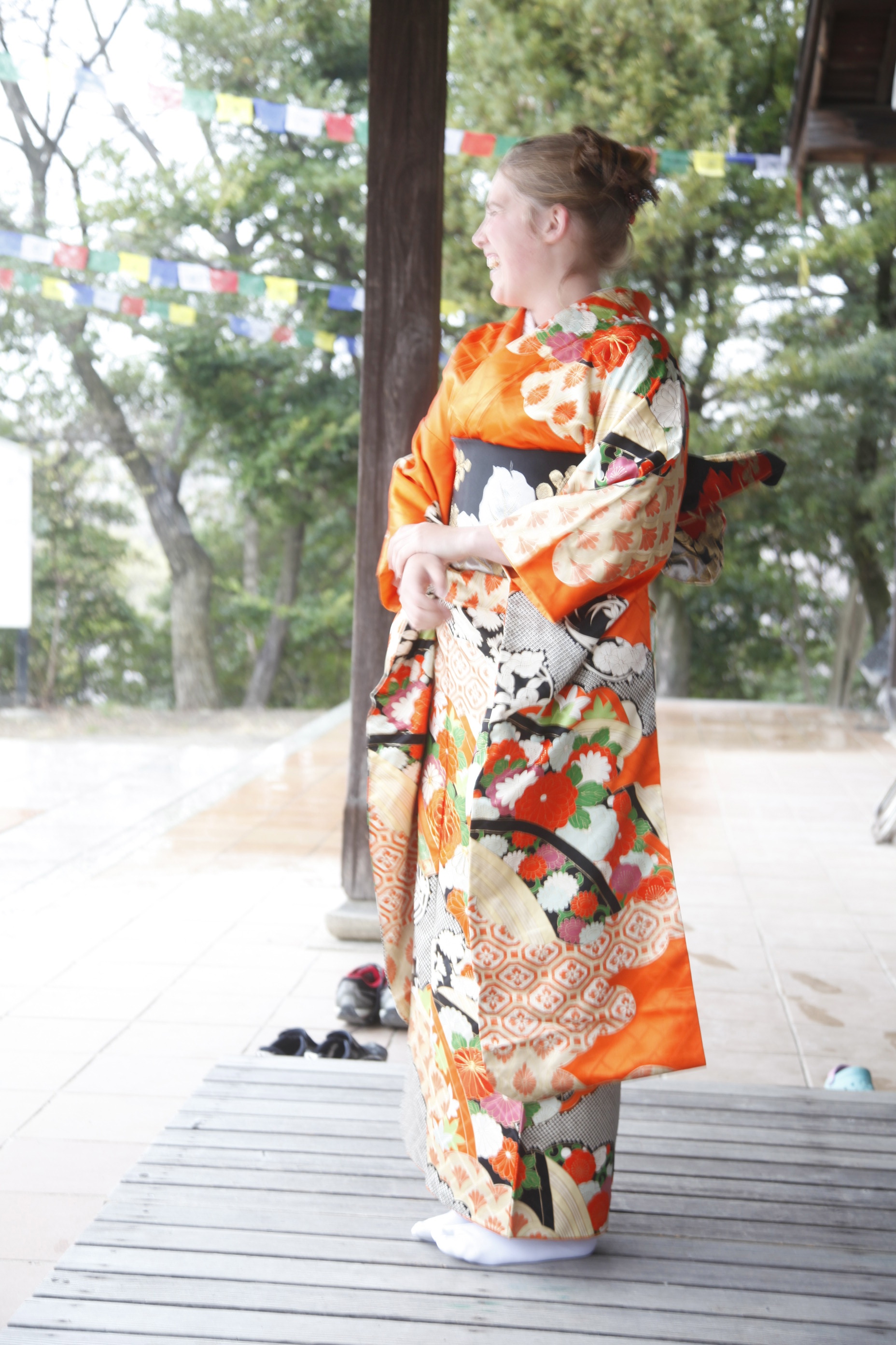 Me in a vibrant kimono. If I remember correctly, this kimono signifies a young, single lady ready to be courted.