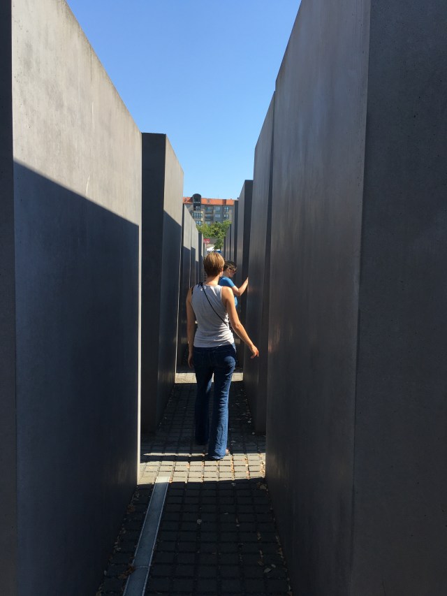 Not too far from the museum district is the Jewish Holocaust Memorial (and other persons persecuted during the war). Colleen had wanted to visit the memorial because she learned about it in one of her college classes. The memorial itself looks simple from the outside, just a bunch of pillars of concrete populating the square. But, the inside creates a different atmosphere. The paths between the pillars go deep into the ground and are paved unevenly. Once in the center, it’s natural to feel an eery coolness and an insecurity in your footing. The architect wanted to create a physical space where persons who did not experience the holocaust could feel uncomfortable, lost, and sad for those lost during the war. Feeling only a very small percentage of what the persecuted felt while during the war.