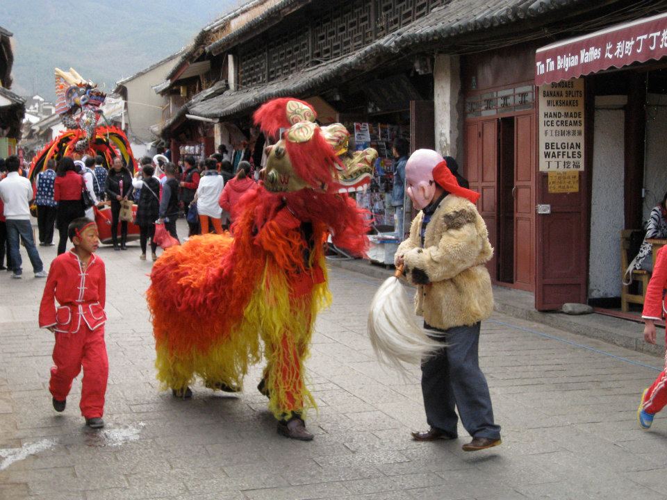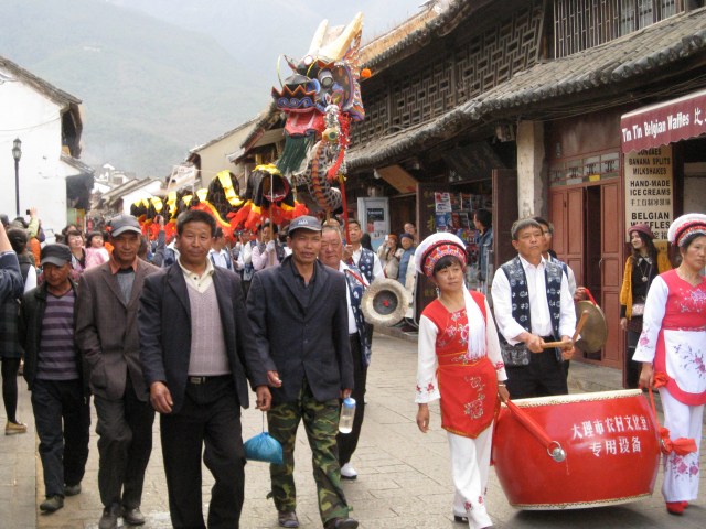 The early evening of our day was the highlight of the whole Dali trip. We had found a Catholic church hidden away in an alley, while we were walking back to the hostel we heard loud drums, clangs of symbols, and singing. When we exited the alley, we found ourselves smack-dab in the middle of a New Years parade! There were 2 dragons, each with 30-40 people in them. There was one man who was in a dragon suit, dancing all around the parade. Then there were dancers and a large band. It was pretty epic.
