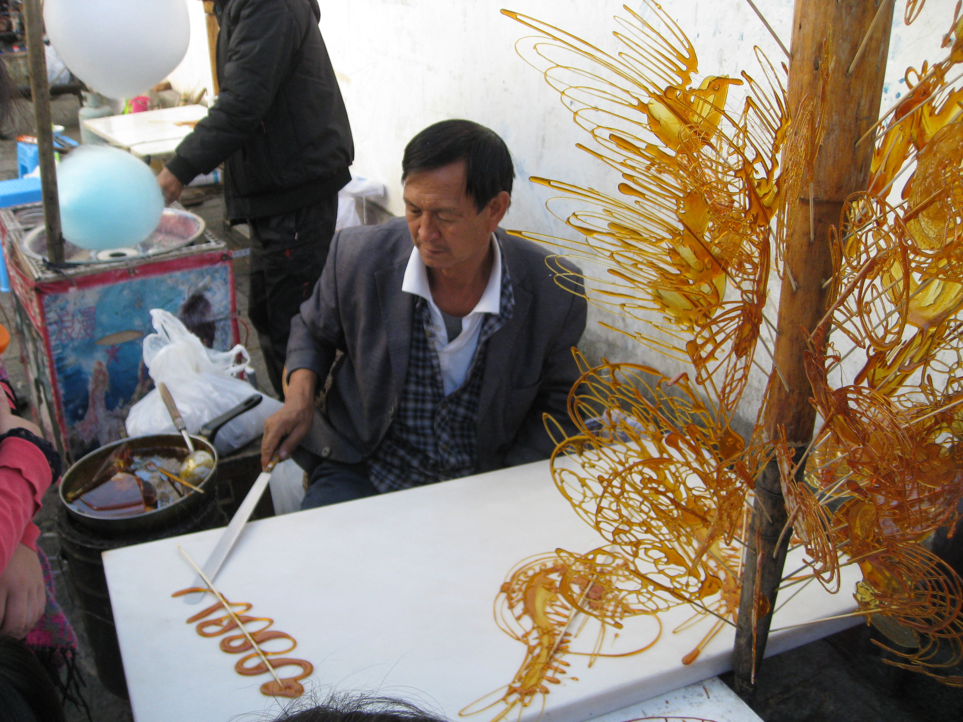 Since people were still celebrating the new year, this man would make zodiac animals for children out of caramel syrup. In this picture he was making a snake for a little girl.